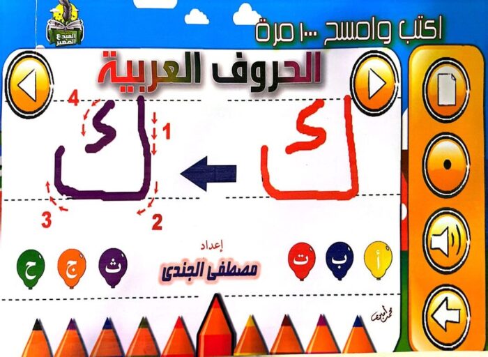 كتاب من 16 صفحة يمكن للطفل التدرب عليه و ممارسة كتابة الأحرف و يمكن مسح ما سبق حتى مئة مرة